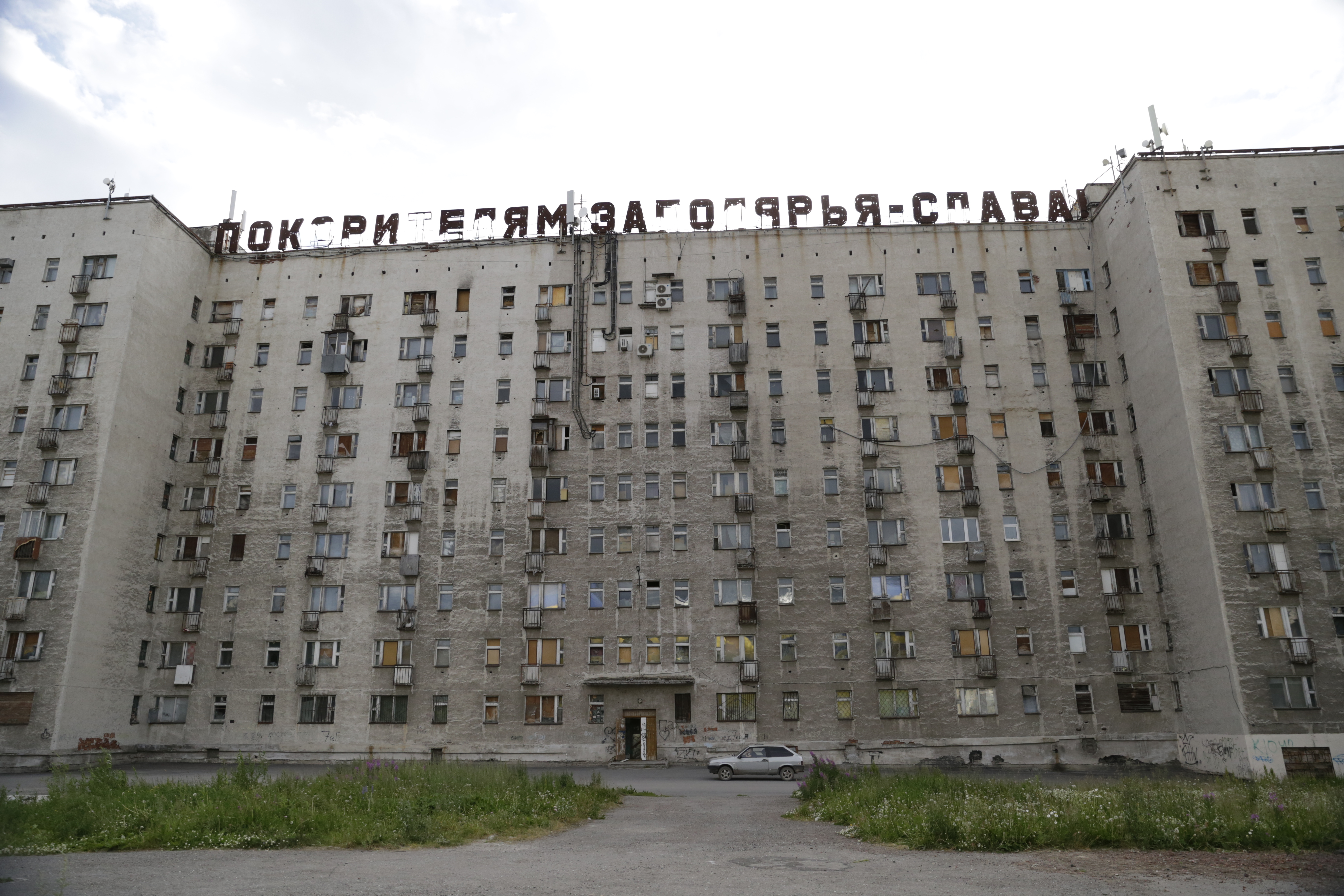 Этот дом в Воркуте давно стал туристической меккой. Приезжих он привлекает символической надписью на крыше «Покорителям Заполярья – слава!» и своей мрачной заброшенностью.