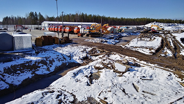 Объемы выполненных работ на объекте внушают «уважение»: забор из профлистов высотой в шесть метров с металлическими откосами, технологические площадки из железобетонных плит с постройками и скоплением простаивающей техники, горы грунта от вырытых котлованов, огромные кучи завезенного песка и щебня.