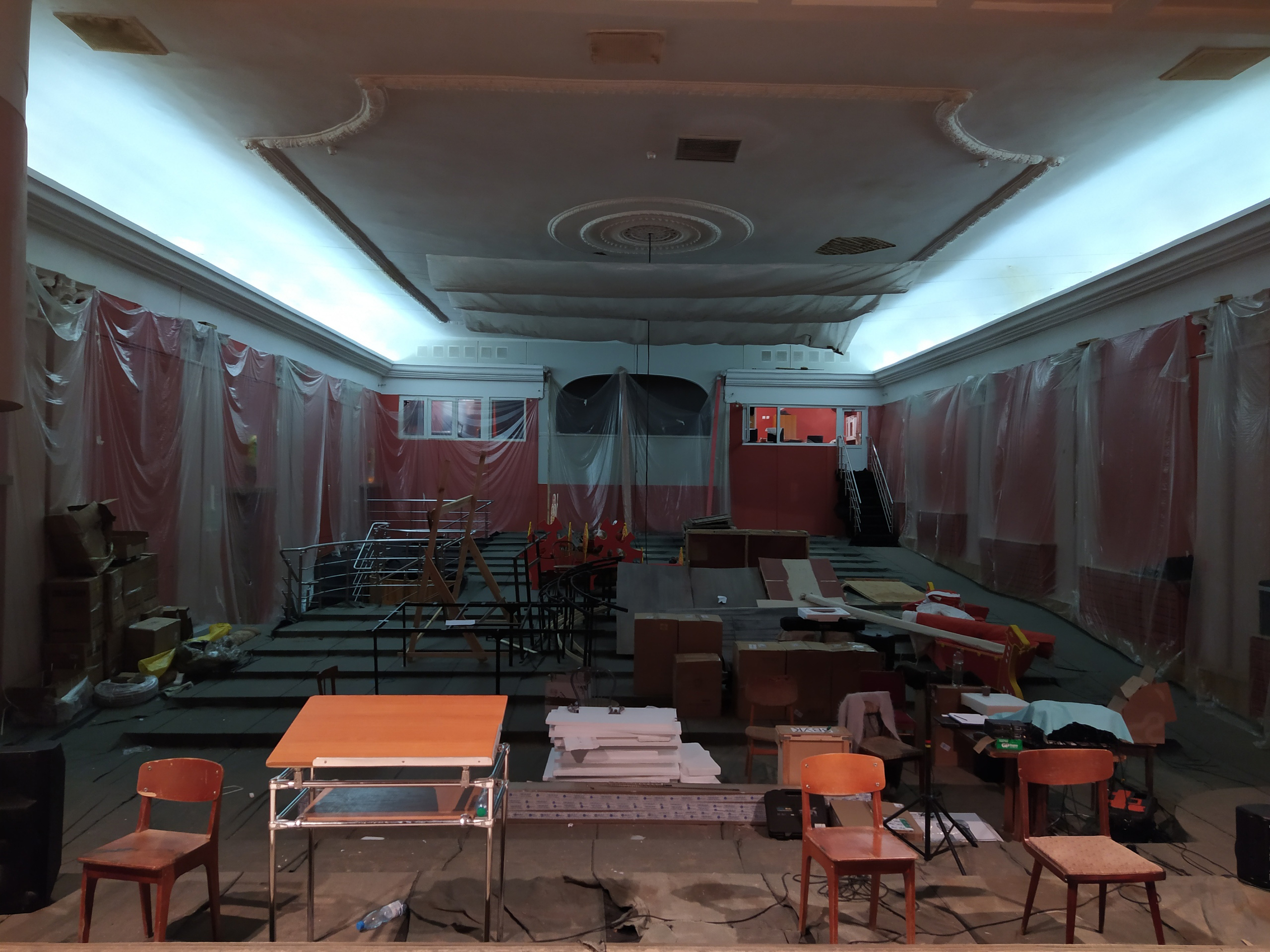 Зал, в котором выступают артисты, находится в ужасающем состоянии. Фирма-подрядчик не справилась с ремонтом кровли. В итоге рабочие разбежались, оставив после себя полный разгром.
