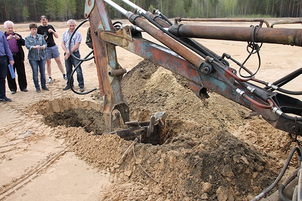 В минувший вторник, 14 мая, на место рекультивированного (по документам) карьера выехала комиссия, в которой находились представители Росприроднадзора, прокуратуры Сыктывдинского района, отдела по охране окружающей среды, общественники, а также корреспондент «Трибуны». Приехали, конечно, и «зачинщики» — А. Головко и Е. Потолицын. Они наняли экскаватор, который вырыл несколько ям.
