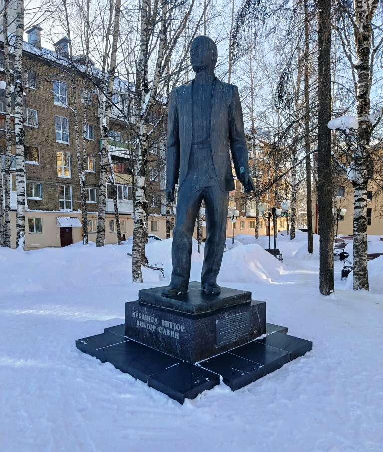 Расположенный возле драмтеатра памятник основоположнику коми советской литературы Виктору Савину возвели в 1994 году, а спустя 14 лет в ходе ремонта постамент бронзового поэта облицевали гранатовым амфиболитом – довольно прочным и долговечным материалом, который прекрасно полируется, подчеркивая его природную красоту и блеск. Считается, что этот камень придает любому пространству индивидуальность и стиль, создавая неповторимую атмосферу. Добывают его в Карелии на месторождении Нигрозеро.