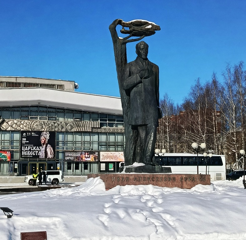 Кстати, три фонтана на Театральной площади, что появились через 30 лет после возведения памятника Куратову, тоже выполнены из гранита. Им же облицована часть фундамента расположенного на этой же территории Института биологии. Но это камень не совсем обычный, его добывают в той же Карелии, называется он Калгуваара, а за красно-черный окрас его именуют «шкурой тигра». Он считается весьма ценным в художественном плане, этот камень часто используется в архитектурном облике Москвы, он также завоевал популярность за рубежом.