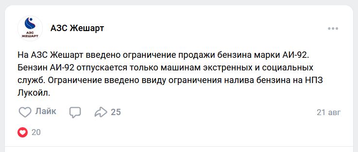 Но тут вступает в дело монополист. На «лукойловских» АЗС бензин заправляют только в бак или сертифицированную тару. А частные заправки, например, АЗС «Жешарт», сталкиваются с тем, что на НПЗ ЛУКОЙЛа им ограничивают налив бензина. И соответственно, им тоже приходится ограничивать продажу некоторых видов топлива. Это уже оскал капитализма или пока еще милая улыбка?