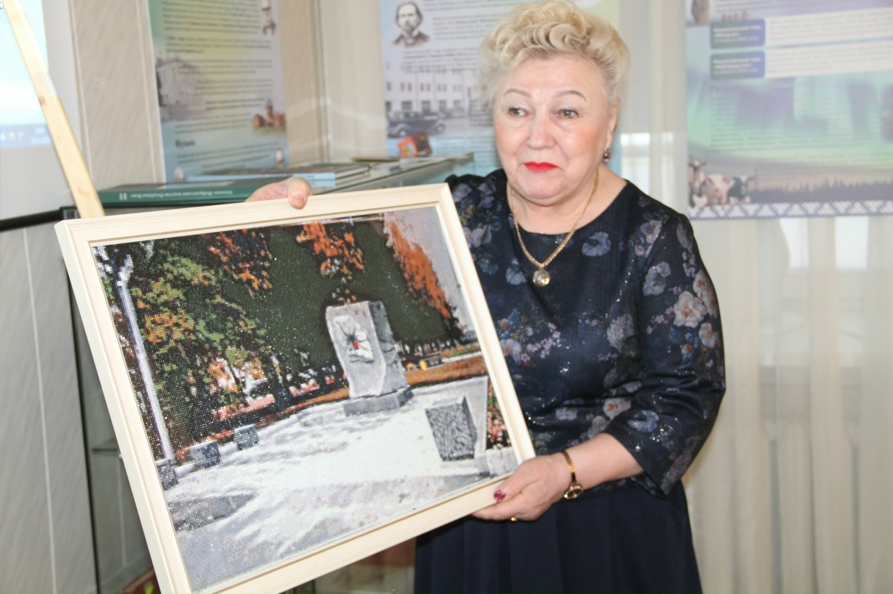 На мозаичной картине запечатлен установленный в центре Сыктывкара памятник ликвидаторам. Автор картины Владимир Лихацкий в свое время жил рядом с Чернобылем. Его картина с минувшего апреля выставлялась в галерее «Пейзажи Севера», а сейчас ее решили передать совету ветеранов.